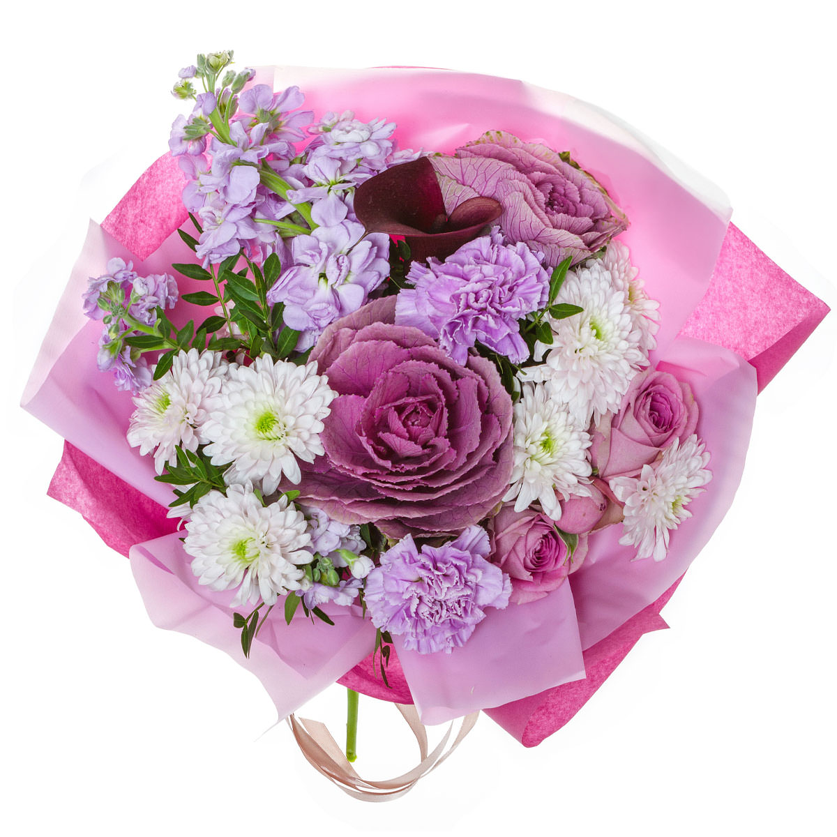 Маттиола сиреневая, брассика, гвоздика фиолетовая, хризантема кустовая белая, роза одноголовая розовая. Упаковка (лента, пленка, крафт, сетка, пленка матовая)