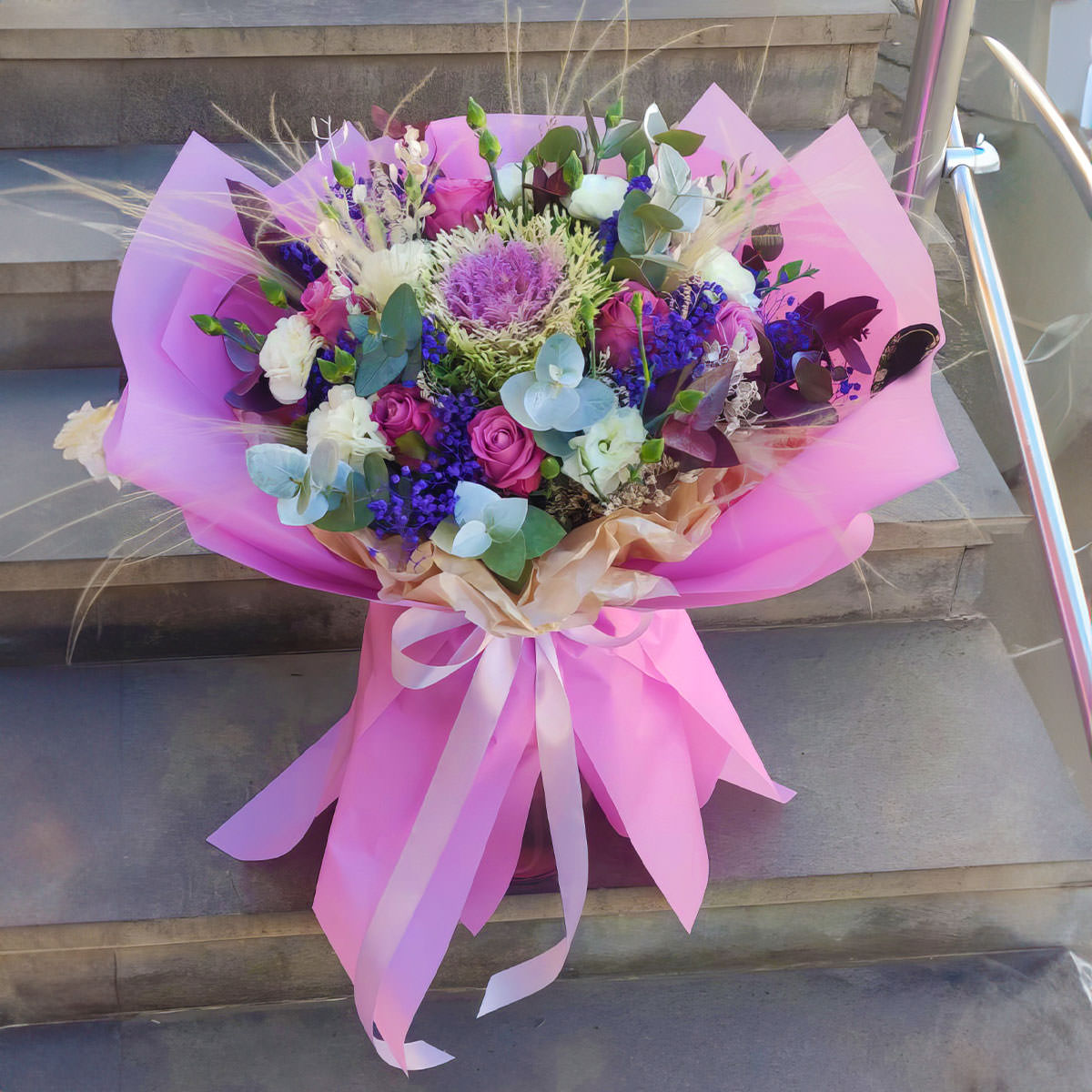 Брассика, роза кустовая розовая, эустома белая, гипсофила синяя, эвкалипт. Упаковка (лента, пленка, крафт, сетка, пленка матовая)